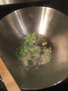 Heat up 1 tbsp cooking oil in a wok over medium heat, saute minced garlic, minced ginger and finely chopped green onion