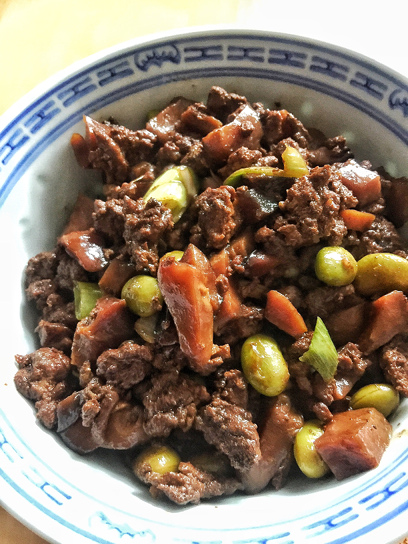 Add five spice powder, cooking wine, dark soy sauce, sugar, salt and water. Cover the wok with a lid and braise for 1 hour over low heat. Then add chopped mushrooms, and continue braising for 30 minutes, and then add frozen edamame beans, and braise for another 30 minutes. Then turn off the heat.