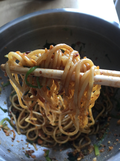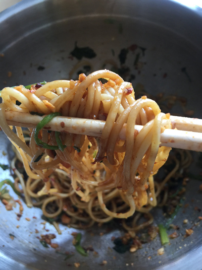 Once the noodles are well drained, put in a big bowl, add 1 tbsp sesame oil and 1 tbsp chili oil, mix well. Set aside