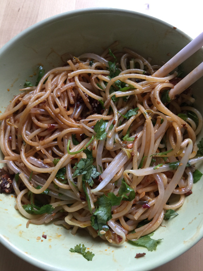 Finally, pour the sauce base over the noodles, stir to combine, and top with chopped cilantro. Mix well.
