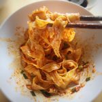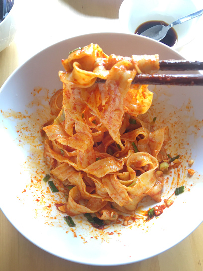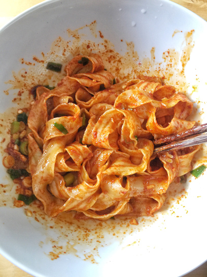Instead of using already-made hot chili oil in the noodle, this recipe makes the chili oil on the spot in the noodle. The secrete is chili powder and hot oil with right temperature. The smell of chili and sizzling sound make you drooling already 🙂