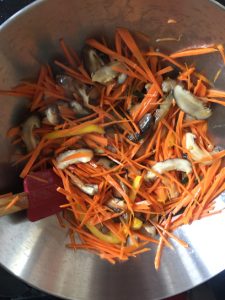 Add carrots, bell pepper and mushrooms shreds, stir fry till soft.